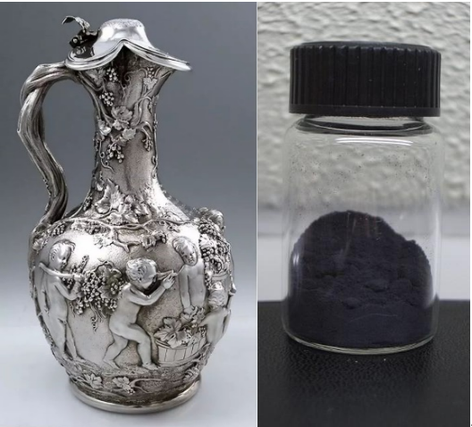 左:古董银酒壶,银匠约翰和乔治 安杰尔为1837年的伦敦奥运会所制作;右:氧化银粉末(图片来源:维基百科)