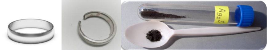 左:崭新的银戒指;中:穿戴一段时间后的银戒指,可见环上有明显黑色斑块;右:硫化银粉末