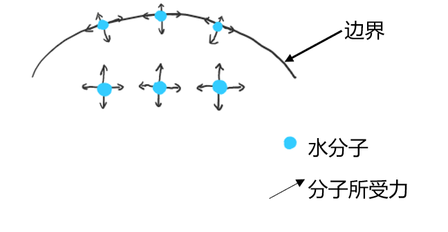 液体的表面具有自动收缩的倾向,而这种自动收缩的驱动力源于分子在液体内部和表面所受的不同引力场。对于液体表面的分子而言,受到来自内部液体分子的引力要大于外部空气分子的拉力。因此,在可以忽略重力的情况下,液体有面积缩小的趋势,总是趋向于形成球形,而在宏观上,这种力被称为液体的表面张力。