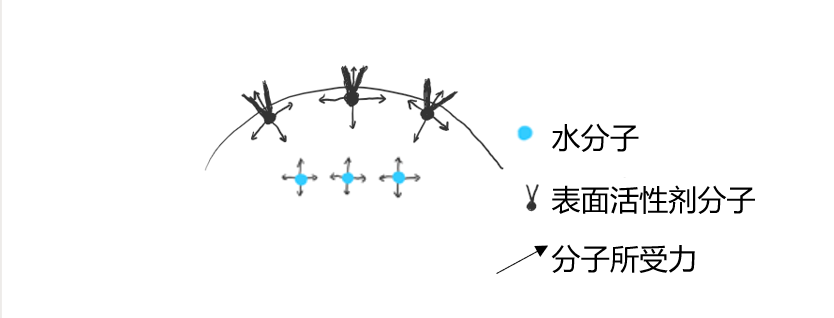 整体而言,向下的引力减弱,向上的引力上升,表面活性剂分子的受力不平衡状况要弱于水分子,因此有表面活性剂分子排列的水溶液表面,显然比单纯的水分子表面受力不平衡的情况更弱,从宏观上看,就是表面张力降低。而这,也就是肥皂水能吹出泡泡的原因。
