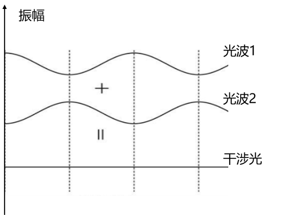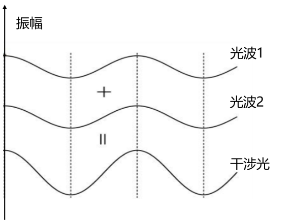 同水波一样,当频率相同的光束相遇时,也会产生相互干涉的情况。值得一提的是,一定厚度的膜,只能使一定波长的光产生稳定的相长干涉或相消干涉,前者指的是两波的波峰(或波谷)同时抵达同一地点,干涉波会产生最大的振幅,后者则是两波的波峰和波谷相遇,使干涉波的振幅减小,而光波的振幅反映了光的强弱,给人眼以物体明暗的感觉。